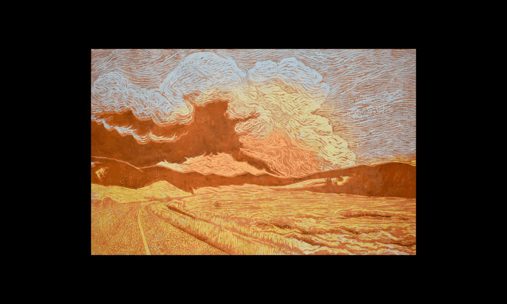 Ava Reynolds is a printmaker based in Jackson, Wyoming, whose expansive woodblock landscapes speak to both ecological fragility and raw natural force. Working on mulberry paper, her intricate carvings capture the tension between permanence and impermanence in the American West—offering meditative responses to wildfire, weather, and topography.