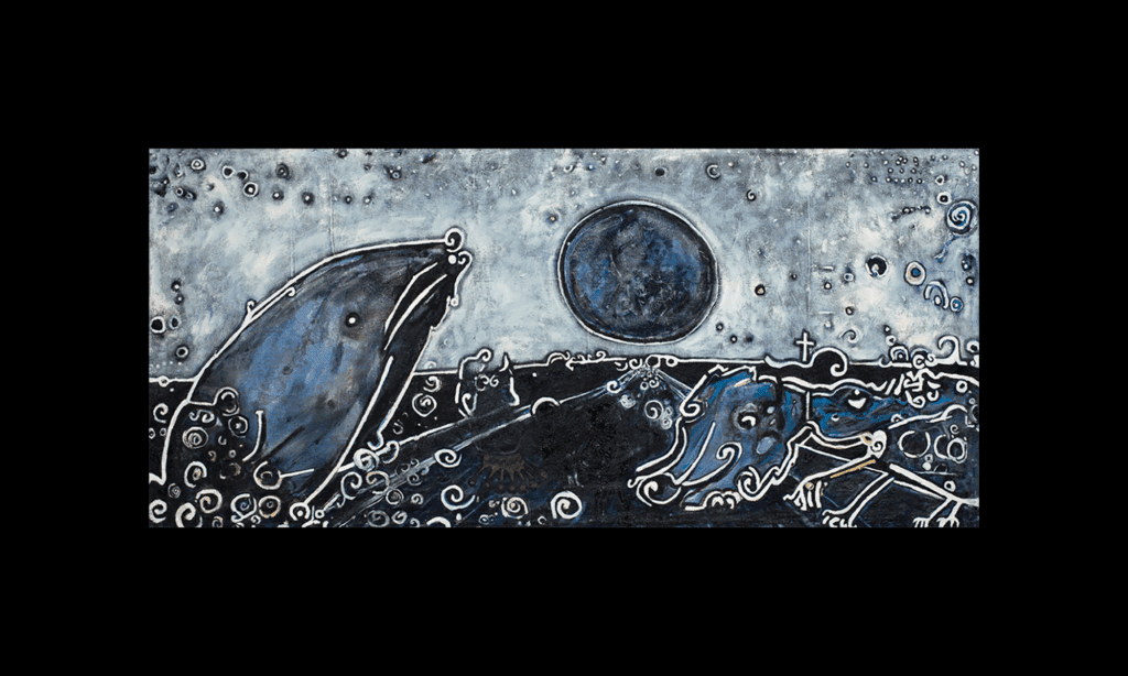 An Orca Dunks its Trainer at Disney World is a dreamlike ocean scene where figures swirl beneath a darkened sky. Painted in oil, the piece blends whimsy with critique—inviting reflection on spectacle, power, and nature’s role in human drama.