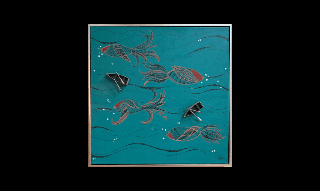 In An Overview, Garg constructs a dreamlike aquatic world where stylized fish glide beneath flowing currents. Embedded within the canvas, miniature boats and oars float above the surface, offering a three-dimensional interplay between texture and illusion. The piece evokes themes of navigation, migration, and interconnectedness—inviting viewers to contemplate where they are in the currents of their own journey.