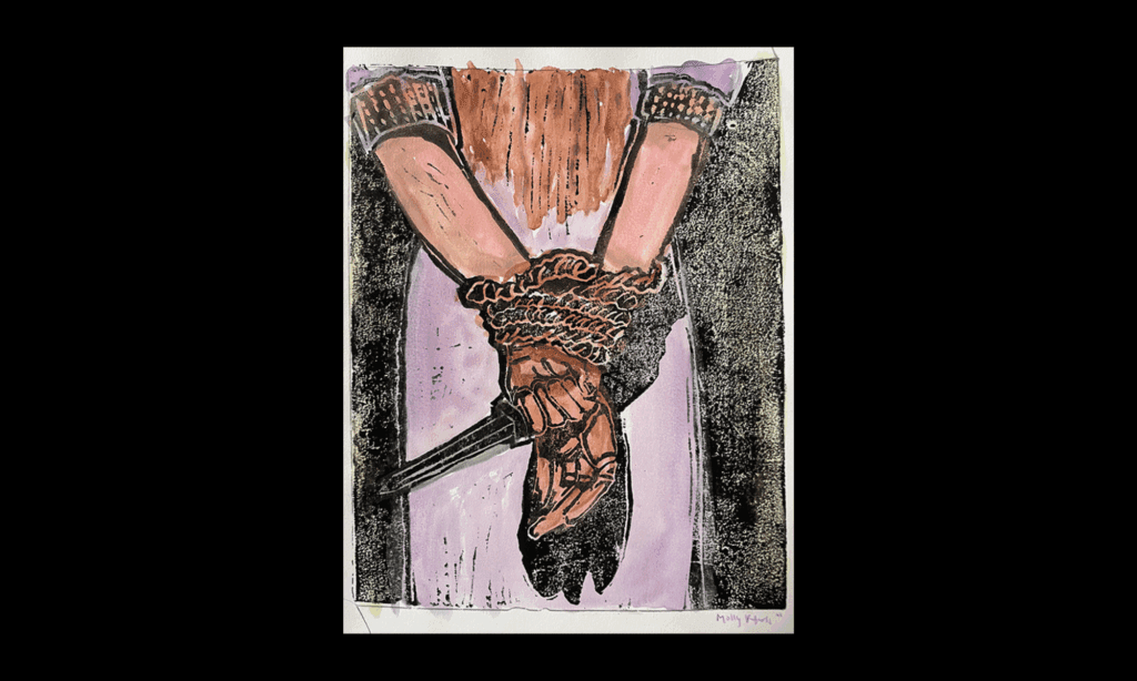 Molly Peters is a Brooklyn-based printmaker whose work investigates themes of visibility, isolation, and quiet resistance. Through layered compositions that merge relief printing, collage, and watercolor, she creates emotionally charged images centered on solitary figures within confined yet expressive environments. Rooted in a tactile process and often incorporating recycled materials, Peters’ prints reflect on vulnerability, constraint, and the subtle strength found in stillness. Her work balances precision and improvisation, using repetition and variation to build poignant visual narratives that speak to resilience in times of upheaval.