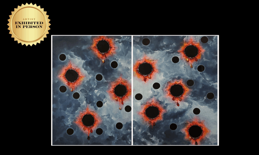 Their compositions defy flatness—sawdust, foam, crystals, and resin are layered into canvases that react to light and perspective. The result is a sculptural visual language that invites intimacy and introspection. Themes of ecological grief, solitude, and impermanence underpin the work, creating portals that shimmer with both beauty and unease.